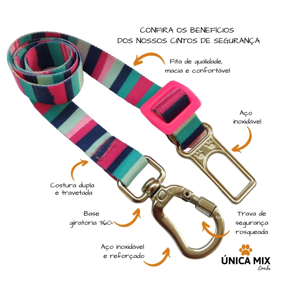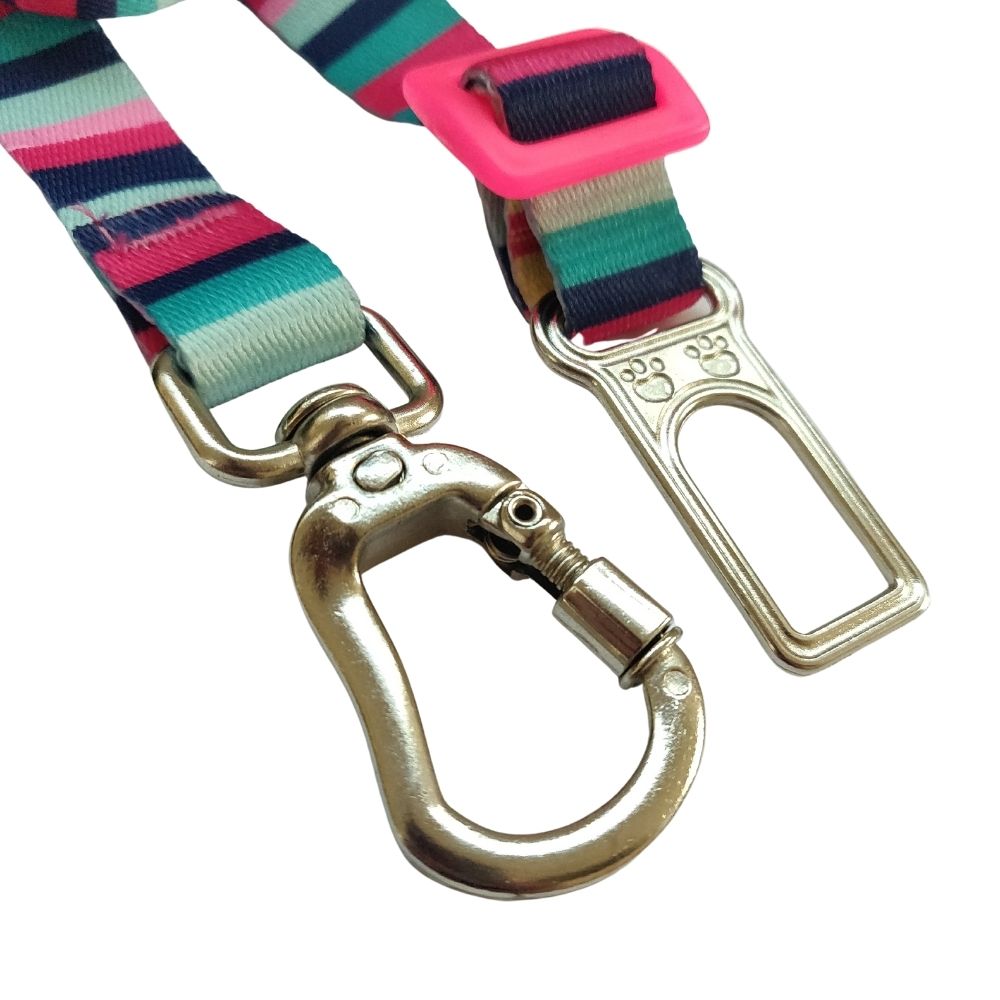 Cinto de segurança para cachorro e gato com trava de segurança rosqueada e com mola, estampa de listras em tons de rosa. Produto nacional de fácil e rápida colocação em seu pet.