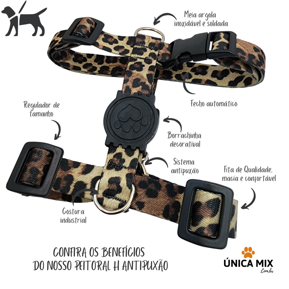 Coleira peitoral H antipuxão para cachorro com guia e trava de segurança rosqueada e com mola.