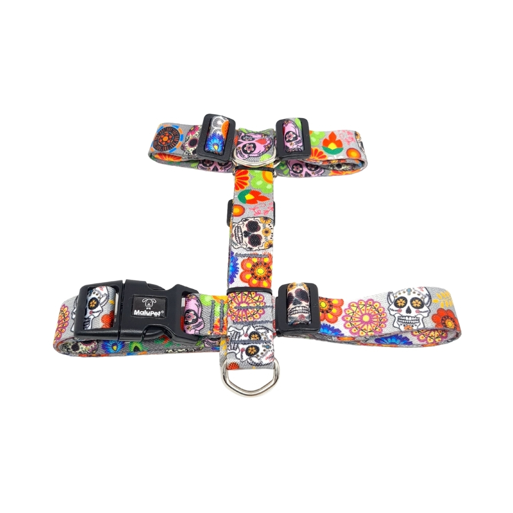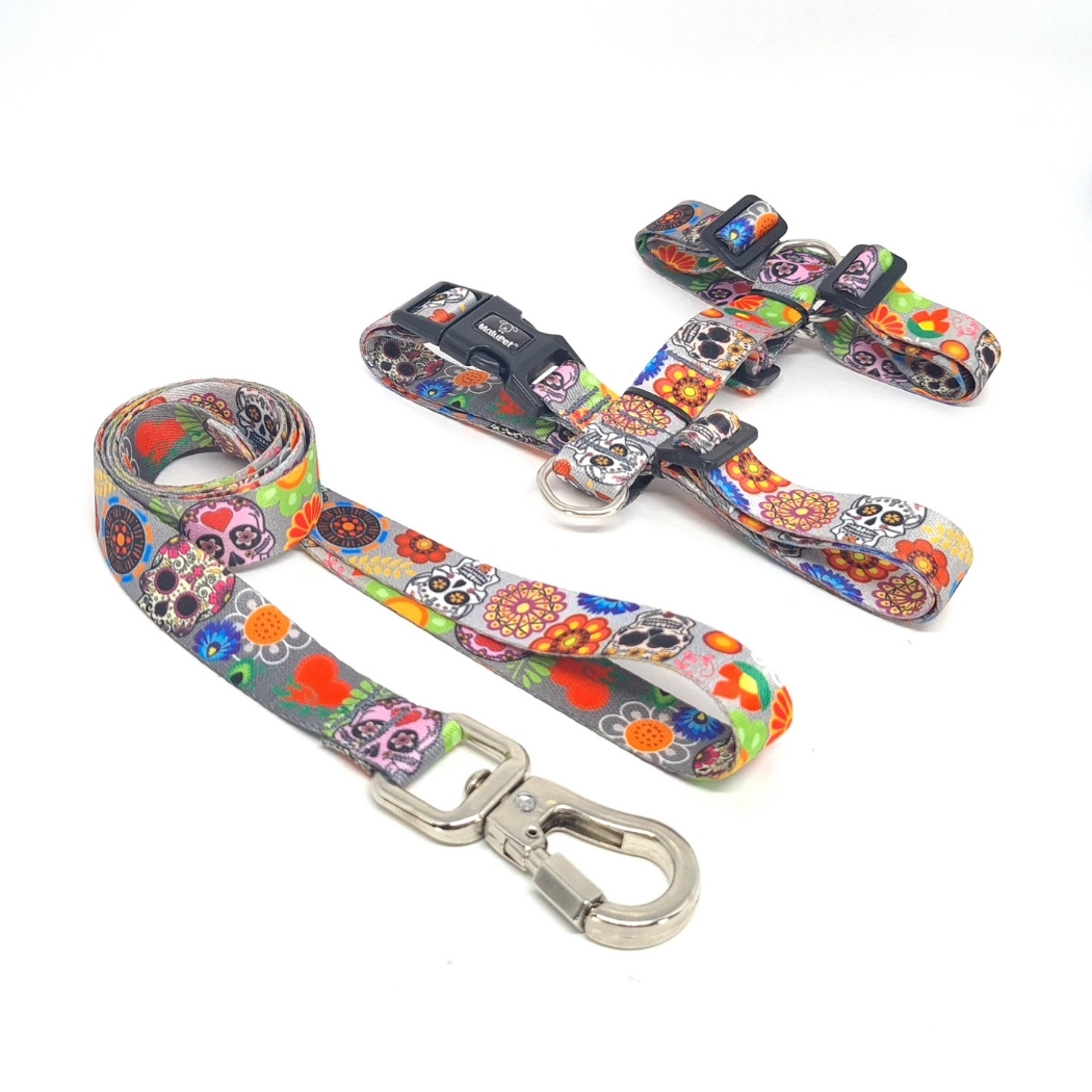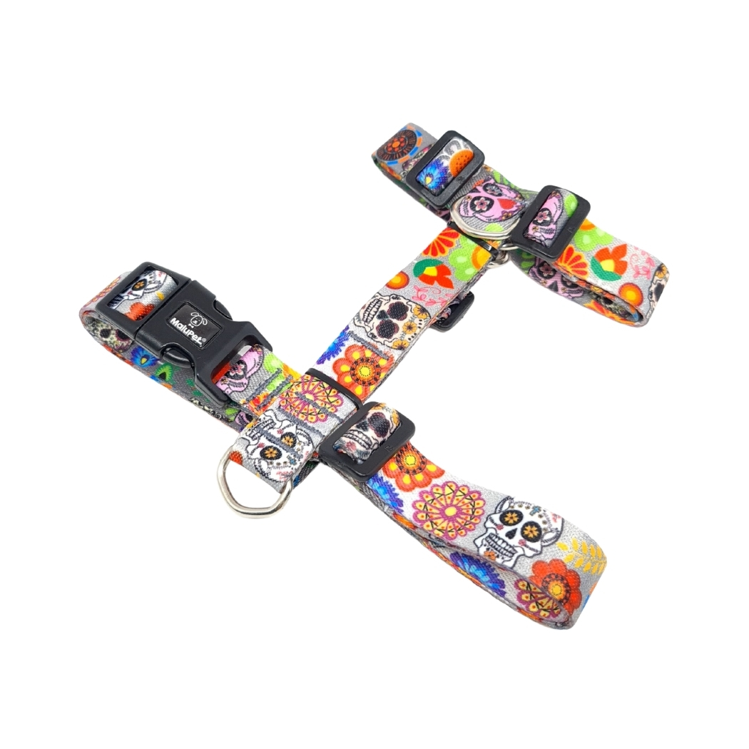Coleira Peitoral Pet H Anti-Puxão + Guia com Trava de Segurança, Estampa Caveira Mexicana